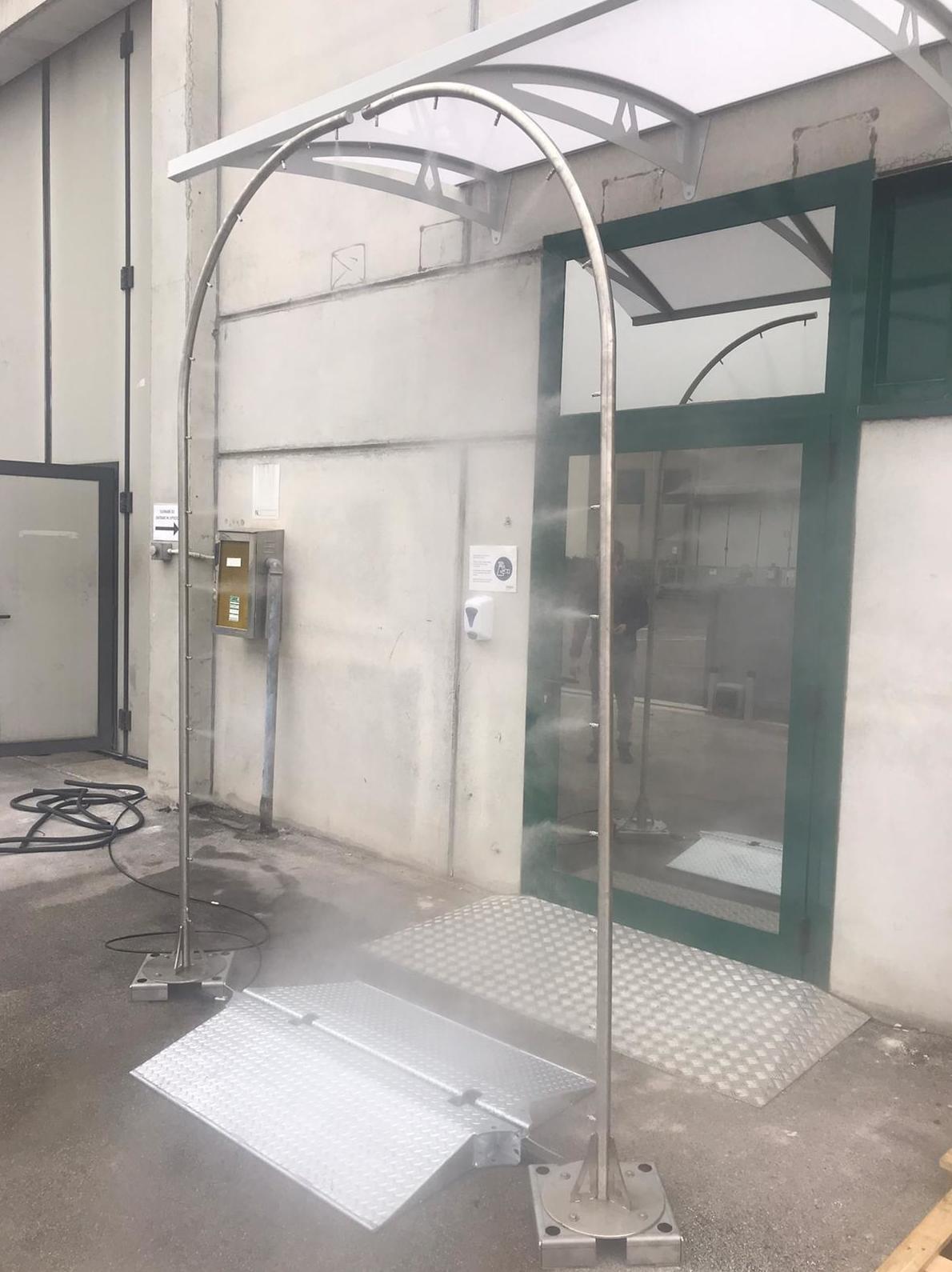 Cuando la persona pasa, el sistema se pone automaticamente en servicio. Toda la persona que pasa entre los dos semi arcos es interesada en la nebulización, desde los pies hasta la cabeza, sin mojarse.